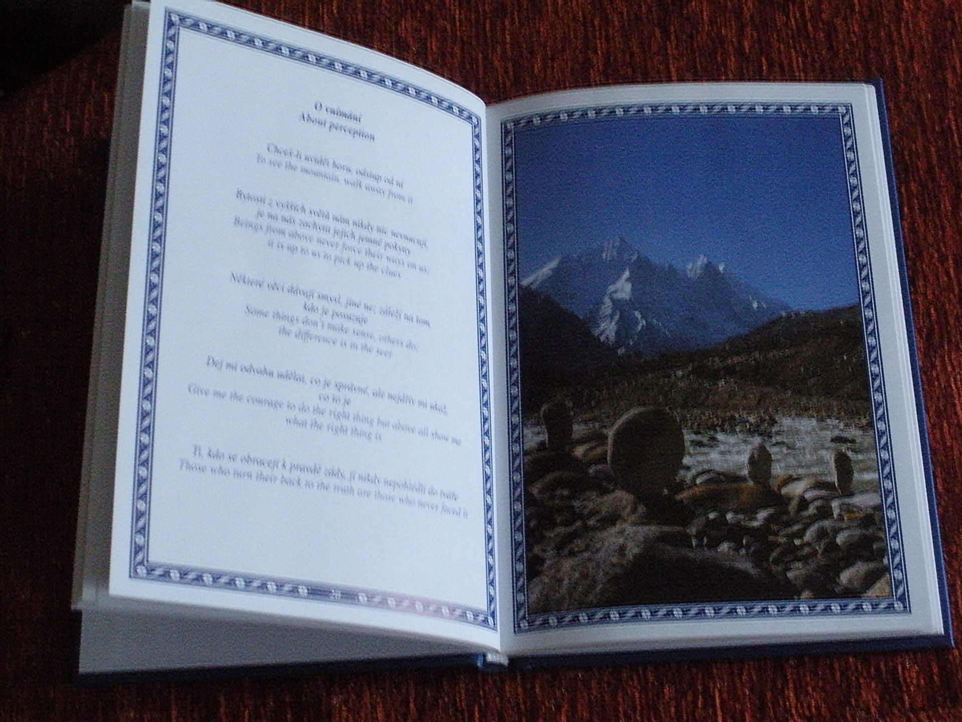 Publikaci ilustrují snímky našich i zahraničních fotografů, cestovatelů Leoše Šimánka a Jana Kratochvíla, brazilského jogína Bruna Descávese aj., z energeticky silných míst planety - pramenů Gangy, Nového Zélandu, Indie a především okolí Cabelly, městečka v Ligurských Apeninách, "Mekky" jogínů z celého světa. Grafická podoba publikace ji řadí do kategorie suvenýrů a její obsah snad potěší jak přemýšlivější, tak také poeticky založené duše. Dvoujazyčné provedení rozšiřuje dosah jejího poselství i na čtenáře z řad cizinců či studentů angličtiny.